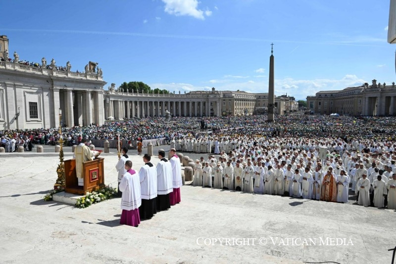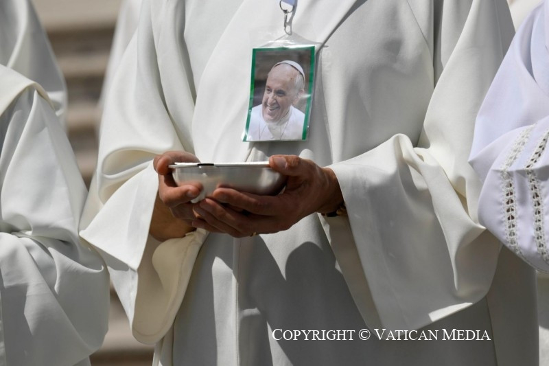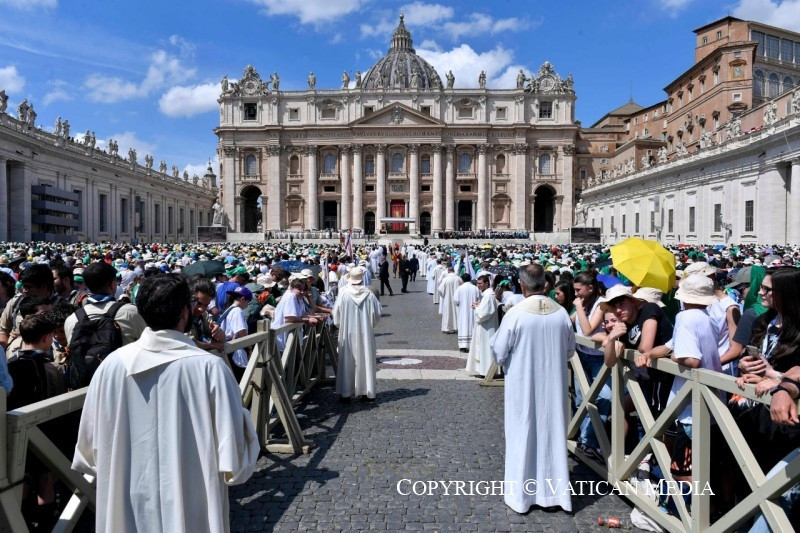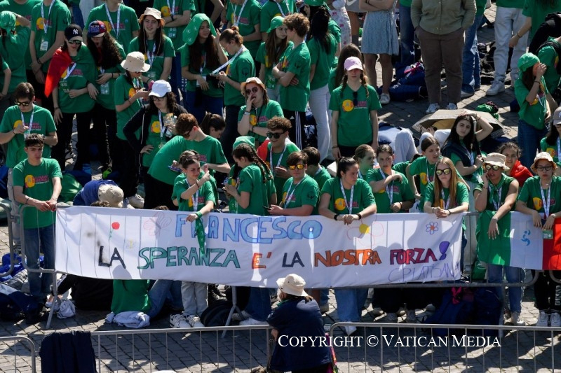 mindenekelőtt a ti arcotokon, kedves gyerekek és fiatalok, akik a világ minden tájáról eljöttetek a szentév ünneplésére. Nagyon sok helyről jöttetek: Olaszország összes egyházmegyéjéből, Európából, az Egyesült Államoktól Latin-Amerikáig, Afrikától Ázsiáig, az Arab Emírségektől… veletek valóban az egész világ jelen van!
