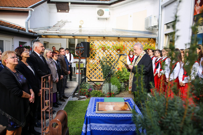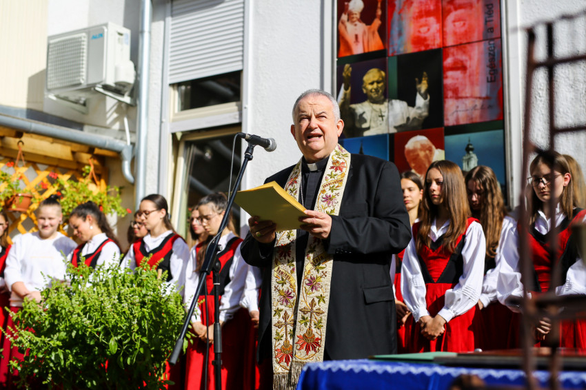 Pintér Gábor érsek, Honduras apostoli nunciusa a ház régi barátjaként van jelen, hogy megáldja a művet. Az érsek arra emlékeztetett, hogy negyvenhárom évvel ezelőtt, éppen ezen a napon iktatták be a szent pápát Péter székébe. „Szent II. János Pál programja megrengette a világot. »Ne féljetek!« buzdításával arra hívta meg a világot, hogy megnyissák az egymástól elzáró ajtókat, határokat. II. János Pál az Isten szeretetére tudta megnyitni az emberek szívét. Közelebb hozta egymáshoz a népeket azáltal, hogy az emberi méltóság, a párbeszéd, a szolidaritás nagykövete volt. Ezt a szellemiséget őrzi ez a ház, amikor elébe siet a rászorulóknak” – fogalmazott Pintér Gábor.