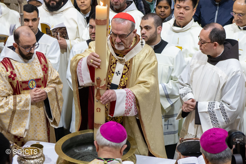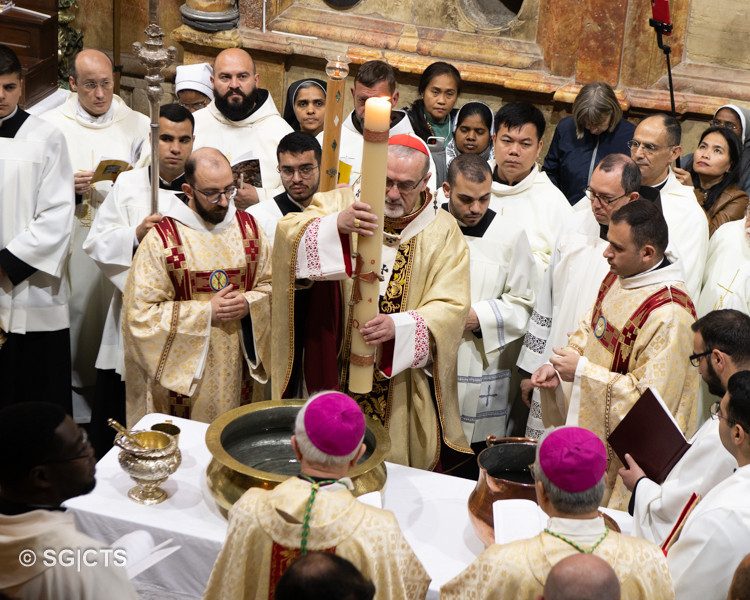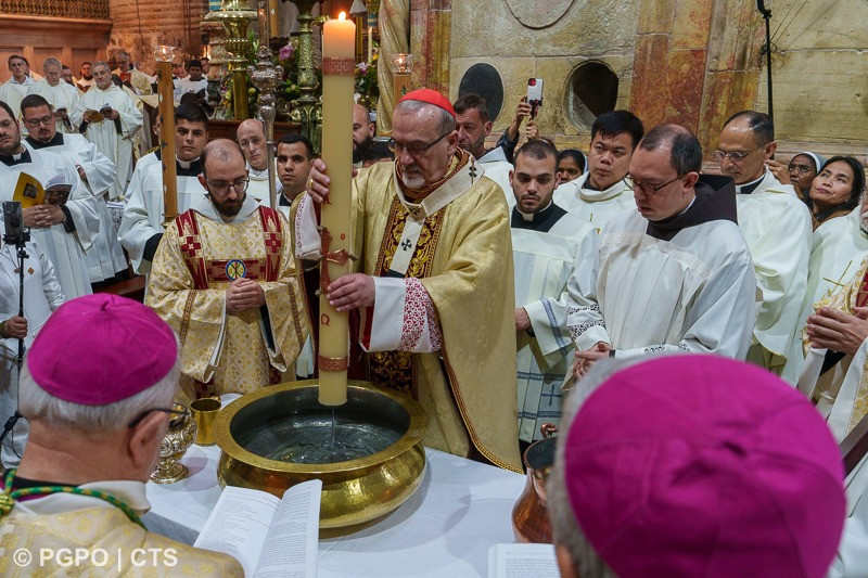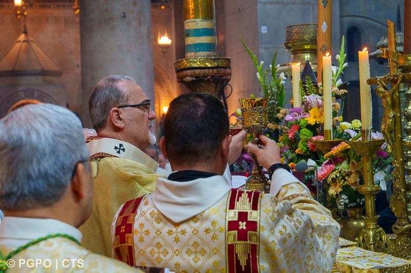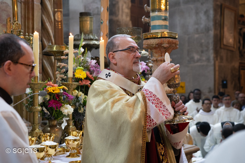 Amíg csak magunkra összpontosítunk, addig nem fogunk mást látni, csak önmagunkat és kész, soha nem fogunk jeleket találni, soha nem fogunk fényt látni. Legyen a mai húsvét egy meghívás, hogy útra keljünk, menjünk ma a mi Galileánkba, keressük az Ő jelenlétének, az élet, a szeretet és a világosság jelenlétének jeleit. Megtaláljuk azokban, akik még mindig képesek a szeretet és a megbocsátás gesztusaira, amire ma jobban szomjazik a világ, mint valaha. Ezt az ajándékot és ezt a kegyelmet kérem mindannyiunk számára, Jeruzsálemi Egyházunk számára, hogy mindig az az Egyház legyen, amely él, remél, szeret és a Bárány világosságában jár.