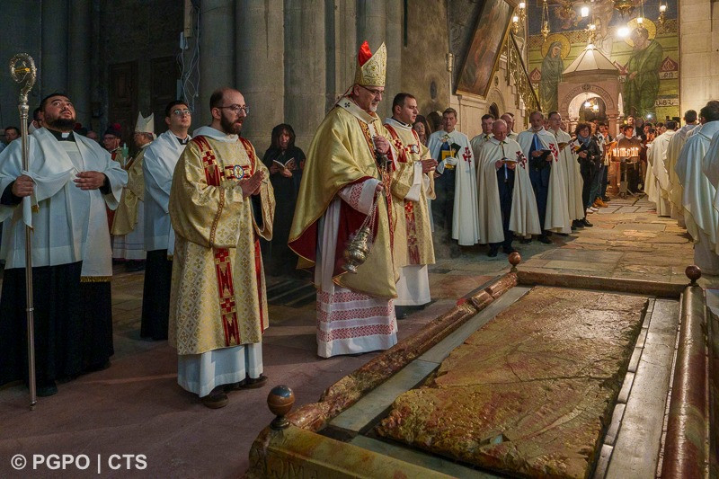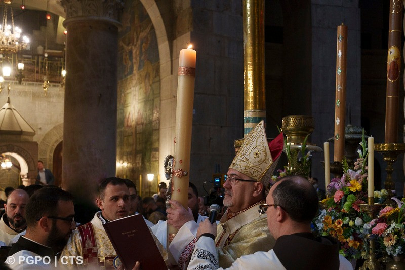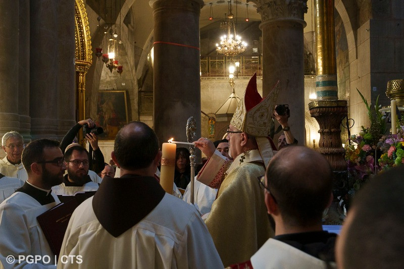 Ez alatt a három, imádságban és liturgiákban gazdag napban minden e körül a kicsiny edikula körül, annak a sírnak a maradványai körül forog, amelyről a mai evangélium szól, és amelyet azóta is itt őrzünk és tisztelünk. A jeruzsálemi liturgia e hely köré épül, akárcsak az egész Egyház liturgiája. Valójában innen merítjük azt a fényt, amely az egész keresztény életet megvilágítja. Mi, a Jeruzsálemi Egyház pedig azok kell, hogy legyünk és azok akarunk lenni, akik elsőként hirdetik ennek a világosságnak az érkezését, és elviszik a világnak. Egyszerű és ünnepélyes módon tettük ezt nem sokkal ezelőtt, amikor a Szent Sírból meggyújtottuk a húsvéti gyertyát. Az üres sírból jövő Fény a húsvéti Bárány világossága, amelyről a Jelenések könyve beszél („templomot nem láttam benne: az Úr, a Mindenható Isten és a Bárány a temploma” – Jel 21,22), amely megvilágítja a Szent Várost és az Egyházat.