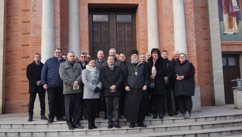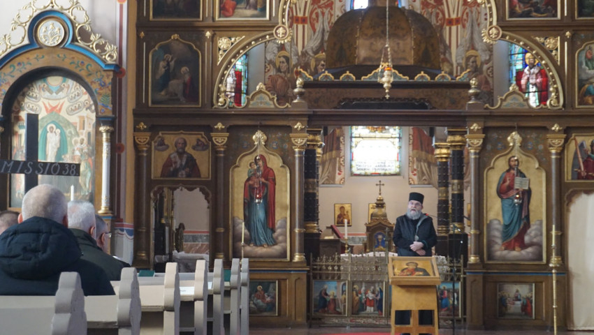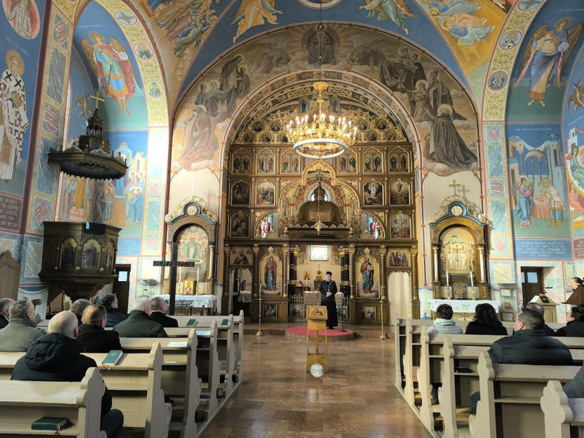 Nem sokkal ezután a székesegyház ikonjai és falfestményei között Orosz Atanáz püspök kalauzolta a vendégeket, egy-egy ábrázolás mögött meghúzódó teológia tartalommal és más egyéb, ma már történelmi eseménynek számító mozzanattal fűszerezve ismertetőjét.