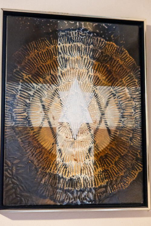 – Igen, később alkotói folyamatokban is találkoztunk. A papírt ugyanis – akkor már „praktizáló művészként” – nem találtam annyira komoly anyagnak, ezért 0.2-es vörösréz lemezt adtam Apámnak – a tűzzománc kedvelt hordozója ez az anyag –, amibe domborítani lehet. Sután kezdett neki, a tollal rögtön ki is lyukasztotta a lemezt. Ám ekkor megpördült az agya: lám, ez is egy módszer! Így alakult ki nagyon érdekes domborított-pontozásos technikája, amitől egészen egyediekké váltak e kései alkotásai. Főleg szobrokat, lámpákat, domborképeket készített, de egyéb nyomatok is szép számmal akadnak az alkotásai között. Közös munkánk is van, több is. Az egyik kedvencem, amelyen a kerethez általa kialakított tartóba helyezett mécses fényétől kap különleges megvilágítást az én képem: játék ez a természetes és a mesterséges fénnyel. Ugyanígy nekem is vannak belsőépítészeti munkáim, amelyek általa megálmodott terekben kaptak helyet. Végül tehát az utunk valóban találkozott az alkalmazott művészetben.