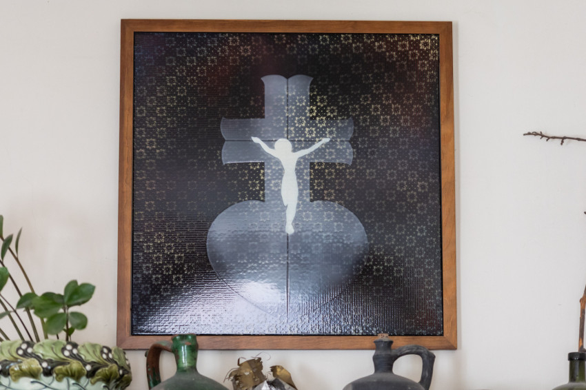 – Mindenképpen. Visszatérő témám a kereszt és a megfeszített Megváltó – sosem az összetört, hanem a karját a kereszten is ölelésre táró Krisztus alakja –, de a Madonna-ábrázolások is kiemelt helyet kapnak munkásságomban. Emellett a templomterek díszítése, a liturgikus terek méltóvá tétele is nagyon szép ajándéka az eddigi pályámnak; több ilyen lehetőségem is adódott. Hívő ember vagyok, sokat jelent számomra, ha magam is részt vehetek egy-egy ilyen munkában. Az egyik legkedvesebb ezek közül a budai Szent Anna-templomhoz kötődik: ide a templom jubileuma, illetve a Nemzetközi Eucharisztikus Kongresszus emlékére készítettem egy-egy nagyobb méretű képet. Hasonló művem található a budai kapucinus templomban is. Ugyancsak fontos és emlékezetes munkám Jánosa Domokos atya felkérésére az Budapesti Egyetemi Katolikus Gimnázium és Kollégium kápolnája oltárképének elkésztése. Ennek Madonnájához (Magyarok Nagyasszonya – a szerk.) egyébként a feleségem volt a modell, az ő hosszúkás arca és finom ívű keze inspirált, a Kisjézus alakjának megformálásánál pedig az első szülött fiam – lényegében őket mintáztam meg egy apró korongokból álló tűzzománcmozaikban. Külön érdekessége ennek a kápolnának, hogy a falakat körben az édesapám által készített keresztút díszíti, amit a már említett pontozásos-lyukasztós technikával alkotott. Budán a várhegy aljában található a Kodály Zoltán Magyar Kórusiskola, ahol ugyancsak a kápolna díszítésében vehettem részt a képeimmel.