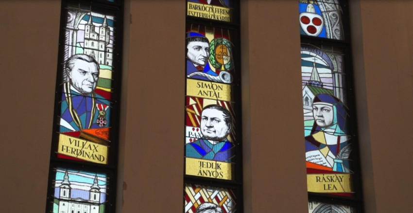 Az ólomüveg ablakokat, melyek Magyarország történelmét meghatározó szenteket, vértanúkat és kiemelkedő személyeket ábrázolnak, Domonkos László készítette.