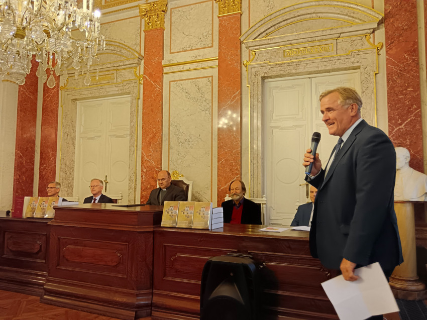 Szirtes Zsófia tolmácsolásával mondott beszédet a nemzetközi projekt vezetője, Rupert Klieber, a Bécsi Egyetem professzora. Kifejtette, hogy a Berlinben 2020-ban megjelent német nyelvű Bischofslexikon javított magyar kiadása részletes életrajzokat tartalmaz 129 püspökről, illetve 170 hivatali időszakot vázol fel, mivel minden negyedik püspök egy másik, többnyire magasabban javadalmazott egyházmegyébe lépett elő. Így először lehet teljes képet adni a magyarországi felsőklérusról, és ezáltal értékes ismereteket szolgáltatni az ország komplex szerkezetéről egyháztörténeti szempontból.