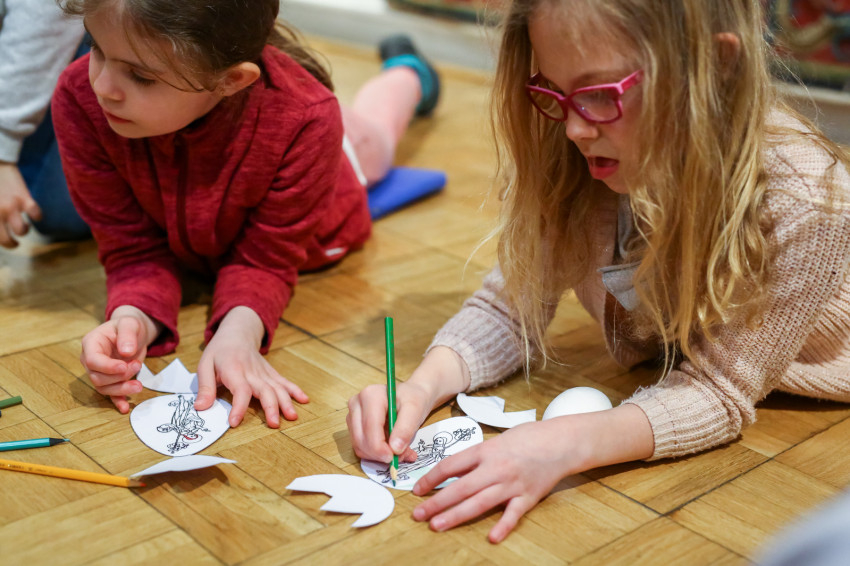 Látogatásunk alkalmával a múzeumpedagógia foglalkozás középpontjában Szentgyörgyi János 19. századi festő Csendélet nyúllal című képe állt. A gyerekek ezen keresztül ismerkedtek a húsvéti szokásokkal. Megtudhatták egyebek mellett azt is, hogy a lányok miért éppen tojást adnak ilyenkor a fiúknak, miért a nyuszi jön húsvétkor, és mindezek hogyan függenek össze az ünnep üzenetével, a feltámadással. A kis múzeumlátogatók minden apró részletet, még a legyet is felfedezték a képen, majd a szomszédos terembe indultak tojásokat keresni. Ezek olyan festmények alá voltak elrejtve, amelyek a szenvedéstörténet eseményeit és a feltámadást ábrázolják, s így alkalmat kínálnak arra, hogy a gyerekek gazdagíthassák az ezzel kapcsolatos ismereteiket. A foglalkozás végén a kisdiákok a különböző színek jelentését megismerve színezték ki maguknak azt az asztaldíszt, amely húsvétkor a családjuk otthonát ékesítette.