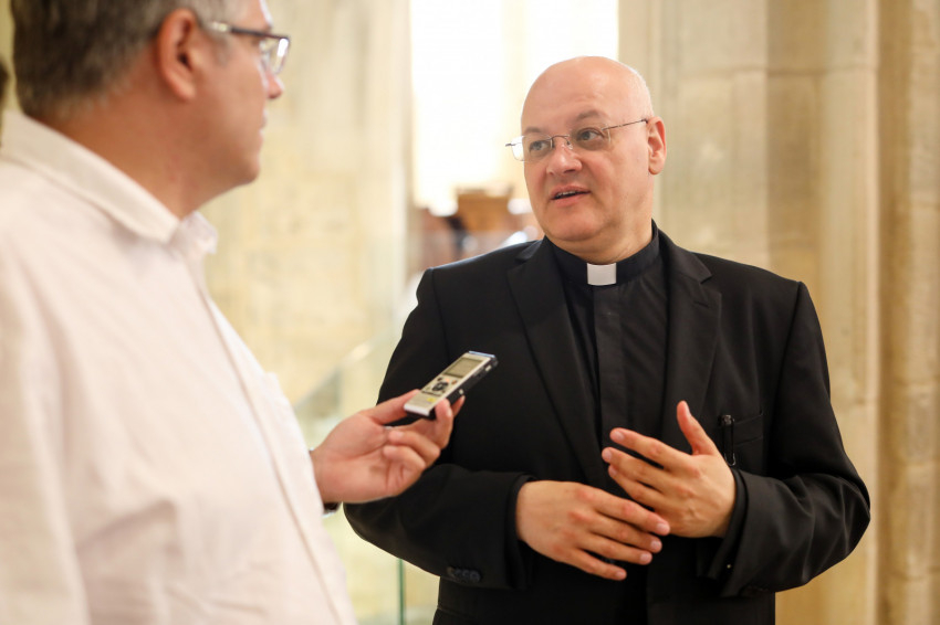 A boltozat alatt újonnan elhelyezett neogótikus keresztelőmedencére mutatva a plébános a kápolna új funkciójáról is beszél: a jövőben itt kaphatják meg a gyermekek a keresztény beavatás első szentségét.