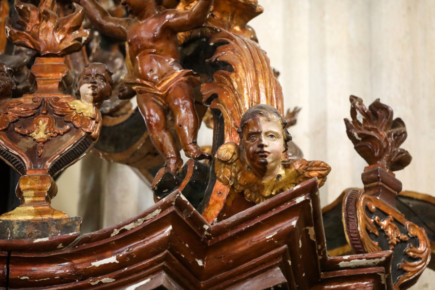 Pár nappal a templom augusztus 13-i ünnepélyes megáldása és az új misézőoltár felszentelése előtt ezekkel az emlékekkel lépek be a frissen felújított Szent Mihály főkapuján, melynek oromzatát Zsigmond magyar király és német-római császár címere és a főangyal szobra díszíti. Kísérőm László Attila kolozs-dobokai főesperes, plébános, aki harmadik éve vezeti a 2018-ban kezdődött felújítási munkálatokat, melyeket az M&M Design tervei alapján a KÉSZ Csoport romániai leányvállalata végez.