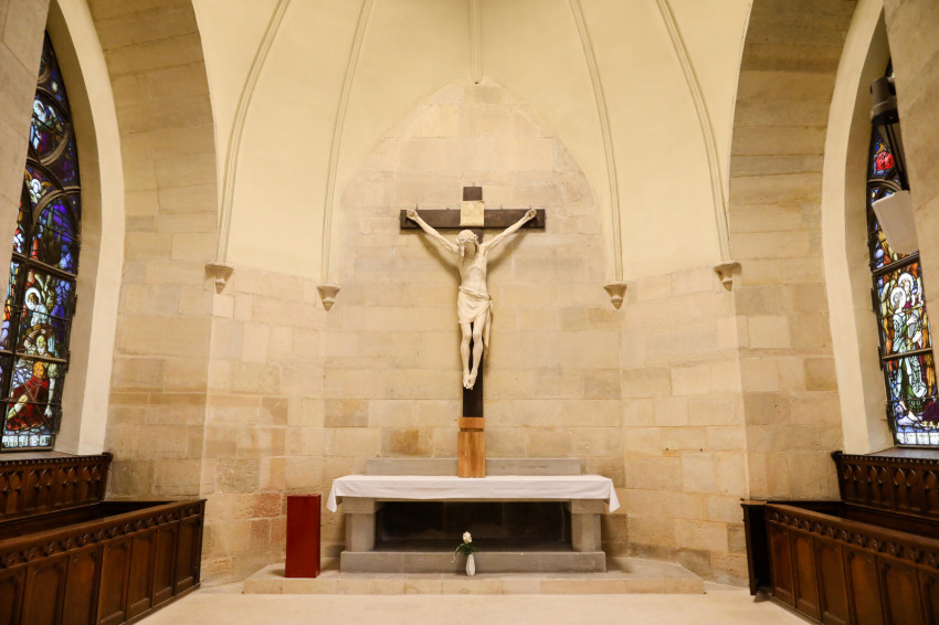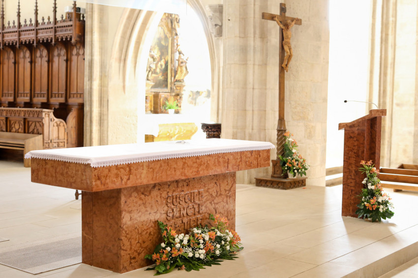 A templom legkorábban épült részéhez, a 20 méter hosszú és 10 méter széles szentélyhez érve szembetűnő, hogy a felújítás részeként új misézőoltár és ambó készült. A liturgikus bútorzat eddig a szentély első oszlopsorával volt határos. Most jó pár méterrel meghosszabbították a szentély járófelületét, és előrébb kapott helyet az oltár, mintegy a templom centrális elemeként, szíveként; közelebb került a hívekhez, még inkább szolgálva ezáltal a pap vezette közösségi szentmiseünneplést. A járófelület minőségi kivitelű megnagyobbításához kőlapokat használtak, így olybá tűnik, mintha eredetileg is így építették volna a szentélyt. László Attila a részletekbe is beavat.