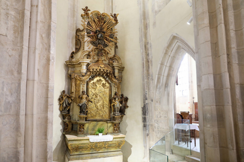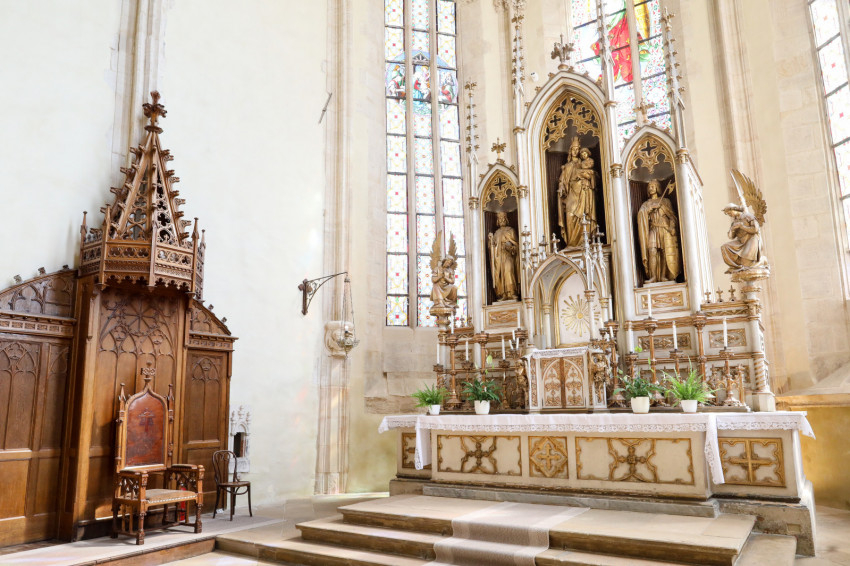 A kommunizmus viharos éveiben elbontották, és darabjait a Schleuning-kápolnában helyezték el, ahol rejtve maradhatott, de a feledés várt rá. A felújítás során aztán az egykori oltárt átszállították a plébánia területére. Amikor László Attila rátalált, és megismerte a történetét, egyértelmű volt számára, hogy ennek az oltárnak méltó helyen kell állnia – később született a döntés, hogy e hely éppen a Szent Mihály-templom új liturgikus tere lesz. Az oltárkőben a korábbi szentek ereklyéi mellett kialakítottak egy helyet, hogy ha majd megtörténik Márton Áron boldoggá avatása, könnyen elhelyezhető legyen itt az új ereklye. A szentélyben találhatjuk a szent életű erdélyi püspökhöz köthető katedrát, amelyet püspökké szentelésekor és később is használt.
