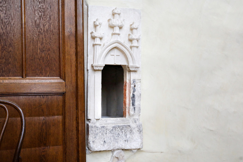Ennek közelében, az oldalfalban bukkantak rá a felújítás során a középkori kialakítású, kis méretű szentségházra, amely az adott kor szentségőrzésének hiteles tanúja. A szentélyből a sekrestyébe lépve azonnal szemünkbe ötlik az eddigi szürkeségét levetkőző, kőből faragott sekrestyeajtó-keret.