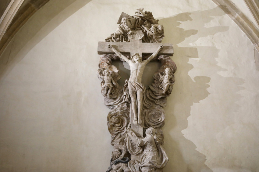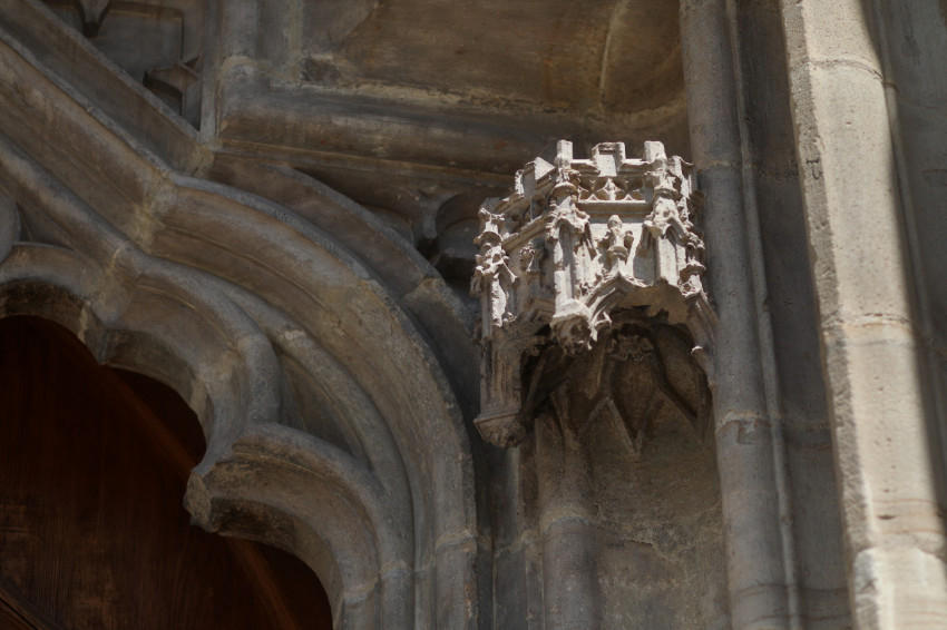 A reneszánsz ajtókeretet 1528-ban készítette Johannes Klein plébános, akinek nemcsak nevét, hanem arcát is megőrizte a remekbe szabott alkotás.