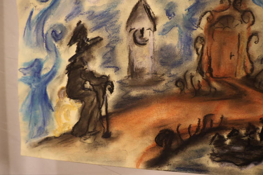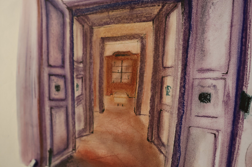 A tanárnő a múzeumnak otthont adó egykori nagypréposti palota későbarokk épületét választották témául. Az idei feladat a térábrázolás elsajátítása, az egy- és kétpontos perspektíva gyakorlása volt a palota belső tereivel, kifestéseivel, balluszteres korlátaival gyakorolva.