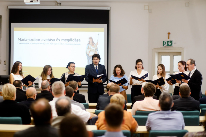 Intézményeinkből sem hiányozhatnak a kápolnák, a feszületek, a szobrok, hitünk nagy misztériumainak, alakjainak művészi ábrázolásai. „Most, amikor Mária-szobrot készülünk avatni, emlékeztessen bennünket ez a szobor – valahányszor csak elmegyünk mellette – katolikus hitünk központi alakjára, Krisztus Urunkra, és arra is, hogy Mária által kaptuk őt. Emlékeztessen arra is, hogy Ő nekünk, magyaroknak nagy támogatónk. Mária minden édesanya felülmúlhatatlan példaképe, és jusson eszünkbe az is: a gyermekek olyat kapnak a jó szülőktől, amit meg nem szolgálhatnak, cserébe amit adhatnak, az a kegyelet, a tiszteletteljes szeretet és a hála” – fogalmazott a rektor.