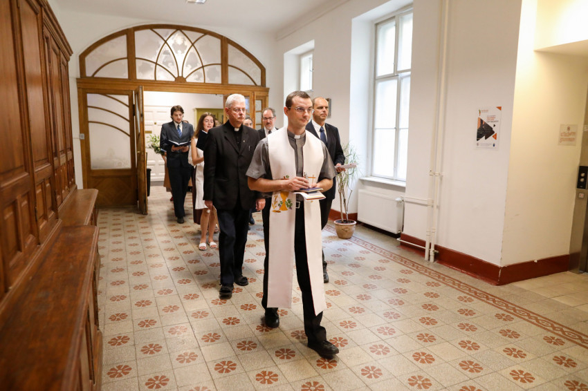 Egyúttal megköszönte mindenkinek a segítségét, két támogatót név szerint is megemlített: Czilli Mátét, aki rátalált a pincében heverő Mária-szoborra, amely úgy illeszkedik a fülkébe, mintha odatervezték volna, és Nedeczky Áront, aki az utolsó pillanatban megszervezte, hogy egy hatalmas kőtömb a pincéből felkerüljön a Mária-szobor alá talapzatként. Köszönhetően a kollegális együttműködésnek, tudható, hogy kihez megyünk, amikor felmegyünk a lépcsőn. A talapzaton ott is van a felirat: venite ad me…, jöjjetek hozzám – mondta a dékán. Ez a meghívás nagyon igaz a nehéz és átmeneti időkben, mint az 1920-as évek voltak – láthatjuk az évszámokat, a bentlakásos gimnázium alapításának az évét (a Sacre Coeur Sophiánum leánygimnázium az első budapesti katolikus leánygimnázium 1914-ben nyította meg kapuit az épületben – a Szerk.) –, de igaz ez az a mai időkre is.