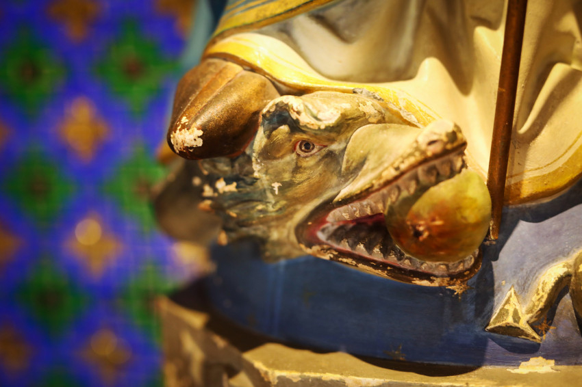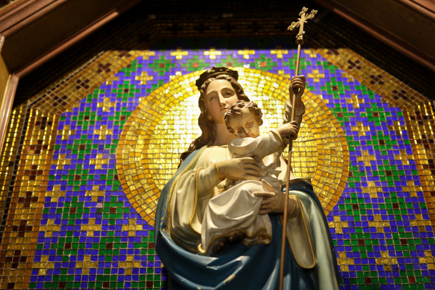 A Mária-szobor is kereste a helyét. Láthatjuk, hogy Mária királynő a Bölcsesség Széke, akihez sokszor fohászkodunk. Akkor is ő a királynő, ha a koronája letört. A középpontban a bájos és aranyos gyermek Jézus van, aki a keresztjével ledöfi a világot felfaló sárkányt. Az ártatlan megöli a bűnt, a saját kereszthalálával és a végtelen isteni szeretettel. A szeretet kiirt mindent, ami rossz, a világot megváltó Krisztus elpusztít minden rosszat. Ha valóban hozzá megyünk, nem veszíthetünk.