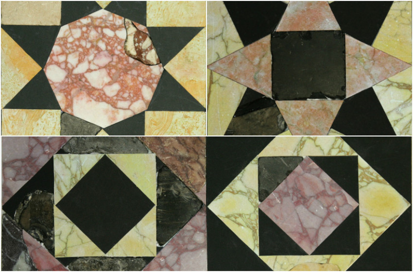 A mozaikpadlót különböző színű, más-más területekről származó kövekből rakták ki, színes geometrikus mintázatokat formáltak a kis kődarabokból. A kézzel faragott kövek alapanyaga a jeruzsálemi hegyekből származó világos mészkő és a Holt-tenger környékén fejtett sötét színű kövek, valamint az Égei-tenger vidékéről importált márvány volt.