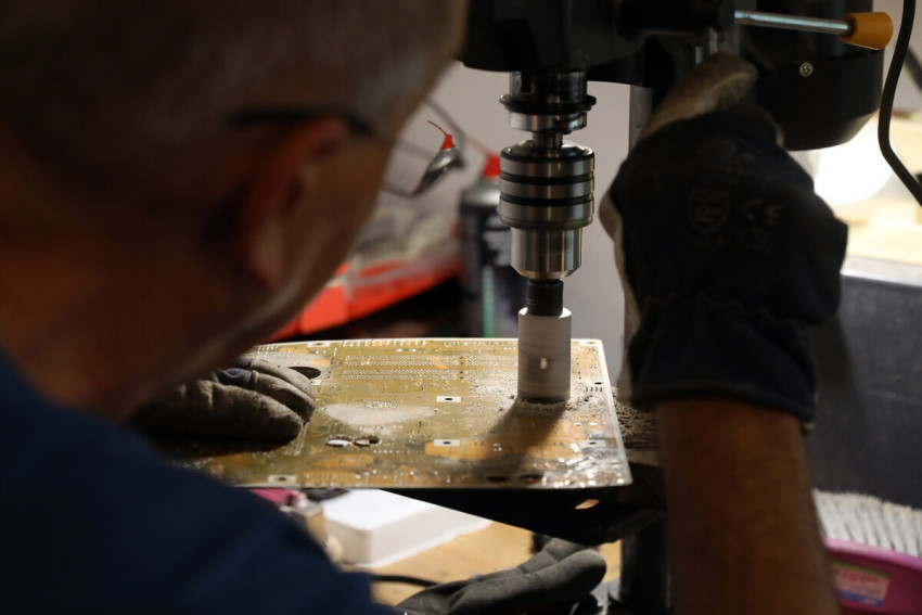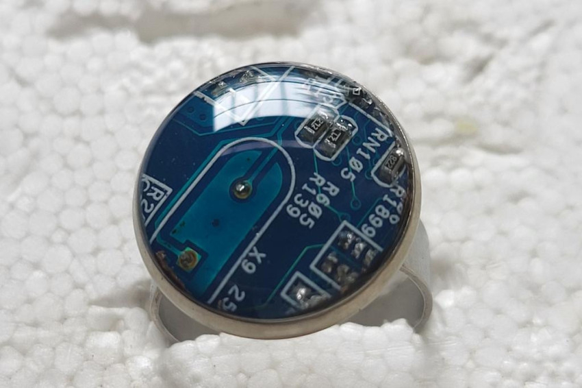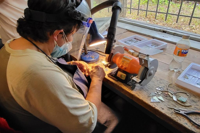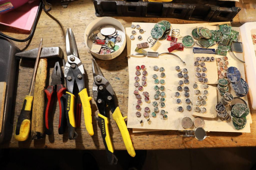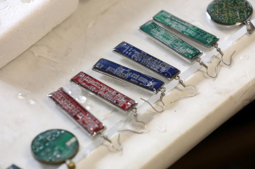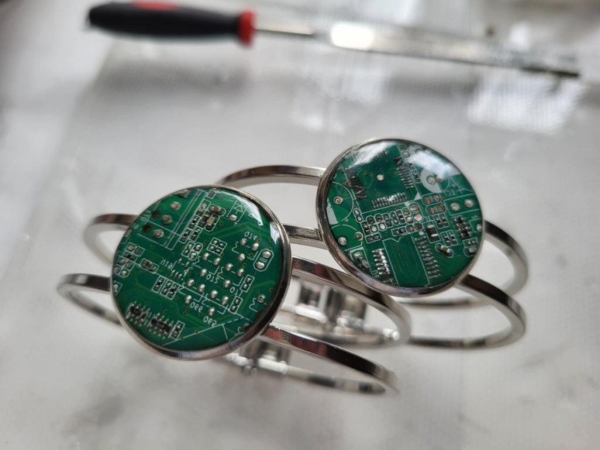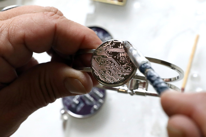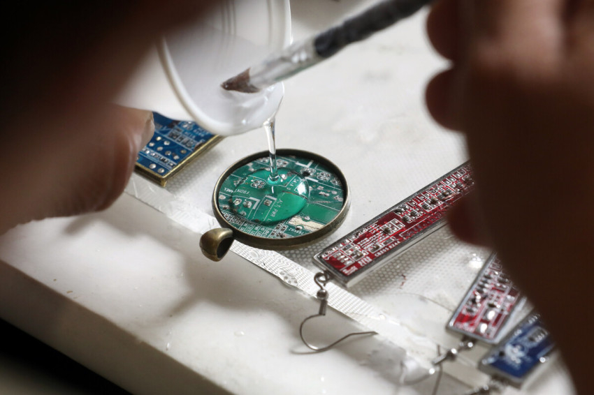 Az alaplapokból kivágott mintákat ezután Vidra Ildikó, a műhely másik munkatársa veszi a kezébe. Gondosan lecsiszolja a sorjás széleket, és addig finomítja a formákat, amíg pontosan bele nem illeszthetők a foglalatba. Ha minden tökéletesen passzol, beragasztja őket a helyükre, a tetejükre pedig gyantát ken, ez adja meg azt a fényes, csillogó felületet, ami az alaplap aranyszínű mintája mellett az ékszer másik fő vonzereje. A művelet nagy precizitást igényel – a gyanta nem lehet túl sok, nehogy túlcsorduljon a széleken –, de Vidra Ildikónak már nagy gyakorlata van ebben. Egy súlyos balesetből felépülve tíz évvel ezelőtt lett a máltai üzem munkatársa, és 2017 óta foglalkozik ékszerkészítéssel.
