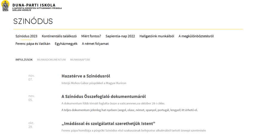 A Sapientia Szerzetesi Hittudományi Főiskola szellemi műhelye, a Duna-parti Iskola e folyamathoz kíván hozzájárulni azáltal, hogy magyar nyelven is elérhetővé teszi a szinódushoz kapcsolódó főbb híreket, dokumentumokat, amelyek ITT érhetők el.