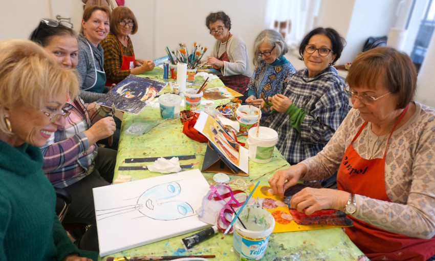 Lángh Ildikó, a csoport művészeti vezetője – miközben minden alkotónak fogja a kezét, azaz hasznos tanácsokat vagy konkrét technikai segítséget is ad az esetleges elakadásoknál – ismerteti csapatuk tevékenységét és különlegességét is. A Magyar Máltai Szeretetszolgálat győri önkéntes csoportjának tagjaiból már nyolc éve alakult meg e művészeti kör azok számára, akik érdeklődést mutatnak a művészeti tevékenység iránt. A csoporttagok és az évek alatt hozzájuk csatlakozó művészetkedvelők nem csak akkor találkoznak, amikor önkéntes munkát végeznek. Eddigi kiállításaikkal azt bizonyítják, hogy az önkéntes tevékenység hatékonyabban végezhető, ha van egy olyan csoport, amelynek a tagjai jól ismerik egymást és közös élmények sora fűzi össze őket. A közös alkotás lelki nyugalmat ad, tovább erősíti a közösséghez tartozást, vagy akár a testi gyógyulásban is nagy szerepet kap. Ugyanakkor a társaság az egyén művészetét is segíti, minden elkészült darab tükrözi készítőjének személyiségét. A mostani foglalkozáson a szorgos munkálkodás mellett már saját karácsonyi ajándéknak szánt festmény alaprajza is felvillan a művészeti vezető ipadjén, ami egy új művészeti technika elsajátítását is előrevetíti. Izgatottan várják, hogyan aranyozzák majd az elkészítendő angyalt, hogy aztán ők maguk is angyalként adják tovább az ajándéknak szánt festményt szeretteiknek, bearanyozva az ünnepeket.