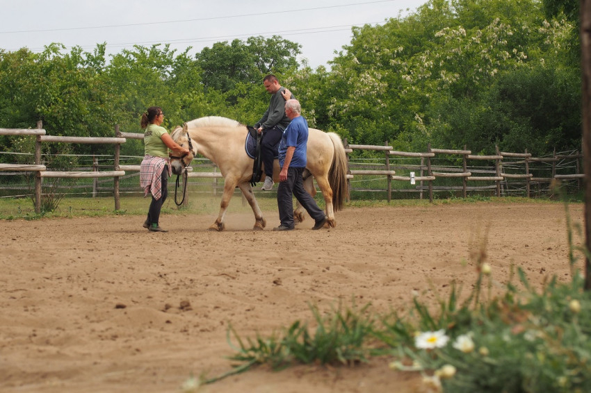 Rácz Gyulus magabiztosabban üli meg a lovat, miután türelmesen kivárta a sorát máltai dolgozó édesanyja, Ráczné Moskovicz Julianna mellett, aki a siketvakok nyelvén, érintéssel beszélget vele. Nagy örömet okoz neki a lovaglás, látszik a testhelyzetén, hogy gyakorlott.