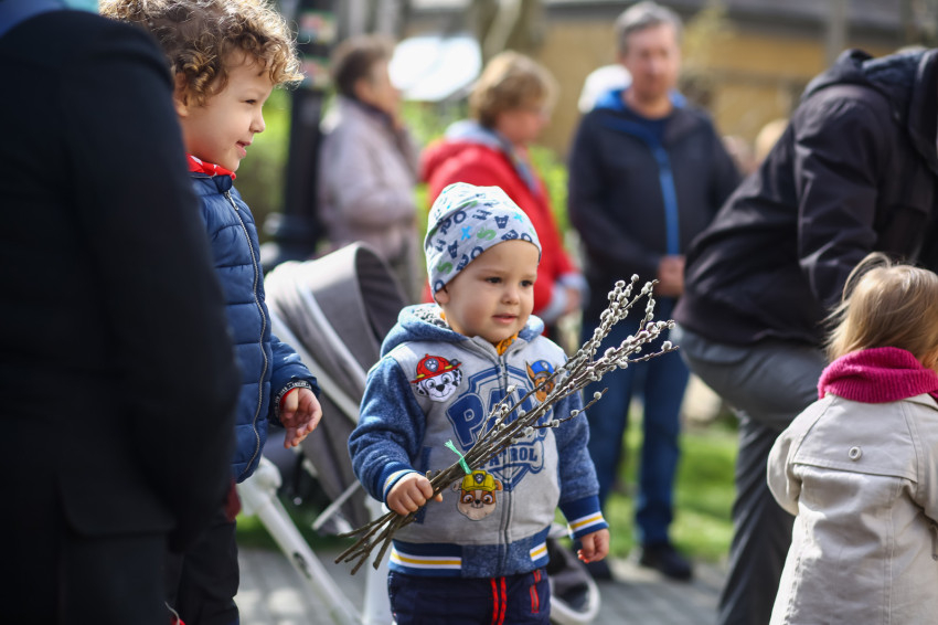„Hozsanna Dávid fiának, áldott, aki az Úr nevében jő, Izraelnek királya!” – énekelte Őri Gergely kántor, miközben a ministránsok és a tizenéves lányokból álló szkóla elfoglalták a helyüket a pálmaágak és a barkák megáldására.