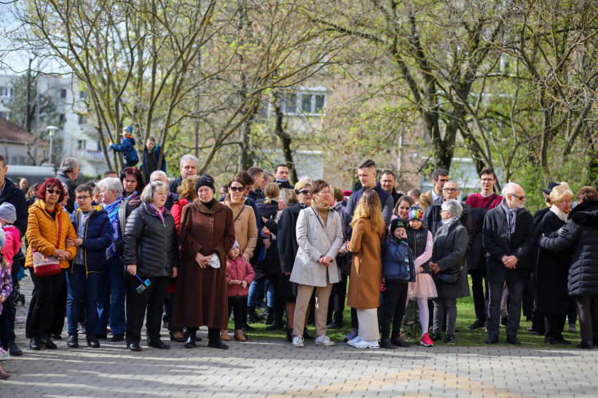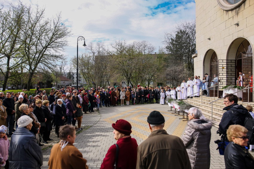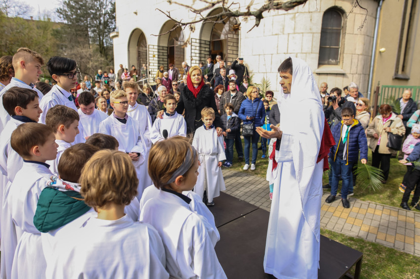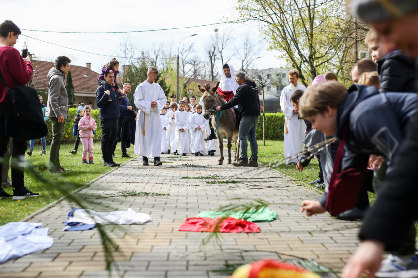 Ő ugyanis ezt a misztériumot akarta beteljesíteni, amikor felment városába, Jeruzsálembe. Szívünk élő hitével és odaadásával emlékezzünk meg erről az üdvösségszerző bevonulásáról. Lépjünk mi is az Úr nyomába, hogy amint kegyelemből társai vagyunk a kereszthordozásban, ugyanúgy feltámadásának, örök életének is részesei lehessünk” – kezdte a szertartást Horváth István, majd megáldotta a barka- és pálmaágakat, miközben a szkóla énekelte: „Jeruzsálem gyermeknépe pálmafáknak ágait hozván elébe ment az Úrnak. S kiáltotta hangos szóval: Hozsanna a magasságban!”