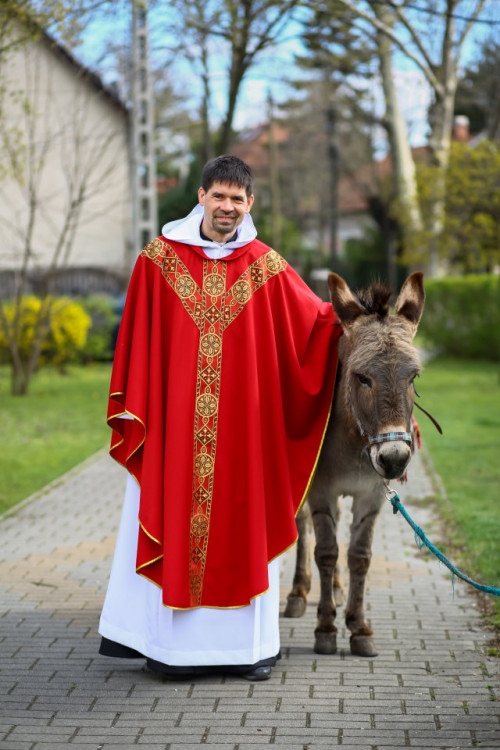 A különösen jólnevelt csacsi bizony nem nagyon szeretett volna rálépni az ágakra és a ruhákra többszöri buzdításra sem, ebben nem követte kétezer évvel ezelőtti elődjét, hanem egy kis kerülővel, szaporább léptekkel érkezett a templom elé.