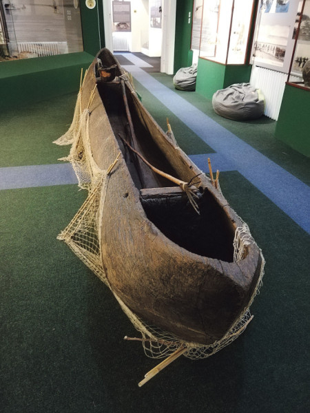 Egyetlen fából faragták ki ezt rendkívül ingatag járművet, ezért is nevezték őket lélekvesztőnek. A deszkahajók csak a 19. század hatvanas éveitől kezdték kiszorítani ezeket a nehézkes alkotmányokat. Túl sok nem maradhatott belőle, itt a kiállításon régi halászháló társaságában megnézhetünk egy szépen restaurált példányt. A víz és a nádas közelében épített halászkunyhót láthatunk diorámaként megépítve. Remek életkép készült a téli halászatról is, amint éppen a jégből kivágott léken át húzza ki a halász a halakkal megtelt hálót. Szerencsére maradtak fényképek is a balatoni halászat idejéből, hiszen mára megszűnt a nagyüzemi halgazdálkodás. A Balaton nyílt vízfelületén halászbokrok, illetve céhek halásztak. A tó téli jég alatti halászata különösen eredményes volt, gyakran egy húzásra több száz mázsa halat fogtak. A jeges halászat úgynevezett öreghálója körülbelül kétszáz méter hosszú volt.