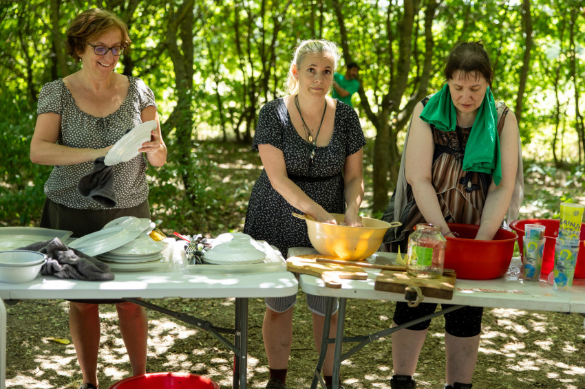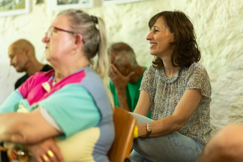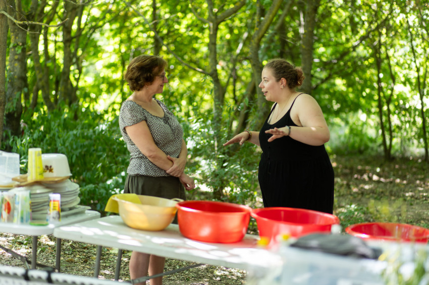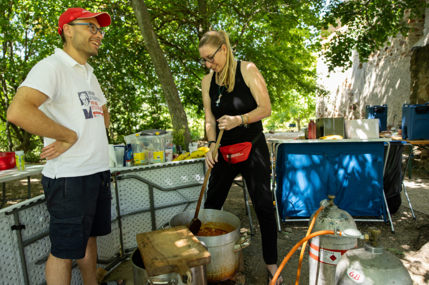 „Olyan érzés, mintha mindig is itt lettünk volna, nagyon természetes itt lenni” – mondta Tóth Andrea, aki máltás intézményben dolgozik, de ide önkéntesként érkezett, a főzéshez osztották be. Jók az átszűrődő hangok, mondja, ugyan nem vesz részt a kiscsoportokban, de hallatszik a zene, miközben készítik a testi táplálékot.