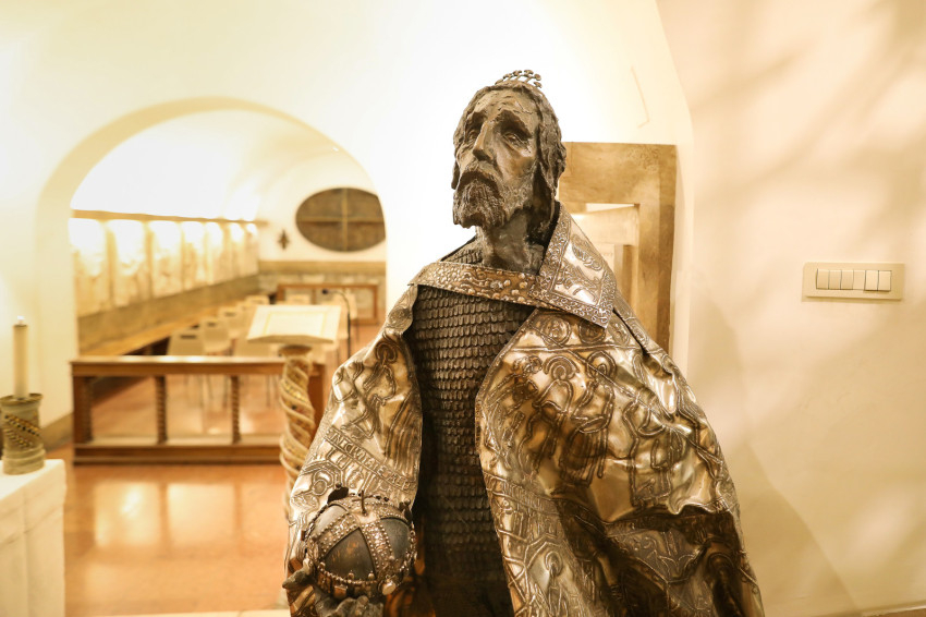 az idős Szent István király szobra tűnik fel, vállán a koronázási palásttal, jobb kezében a Szent Koronát tartva – a Regnum Marianum gondolatának kortárs kifejeződése ez a térbe kilépő kompozíció.