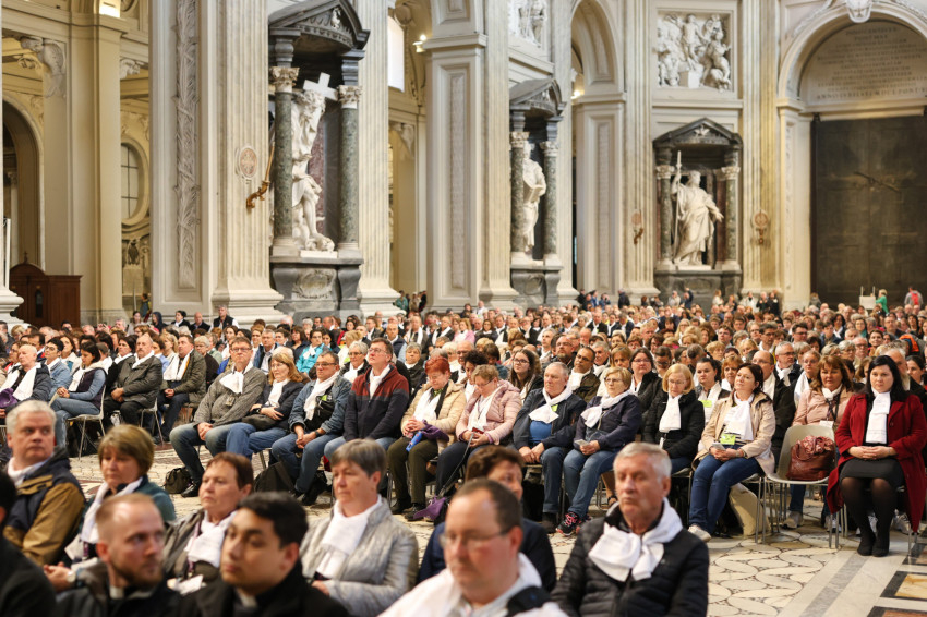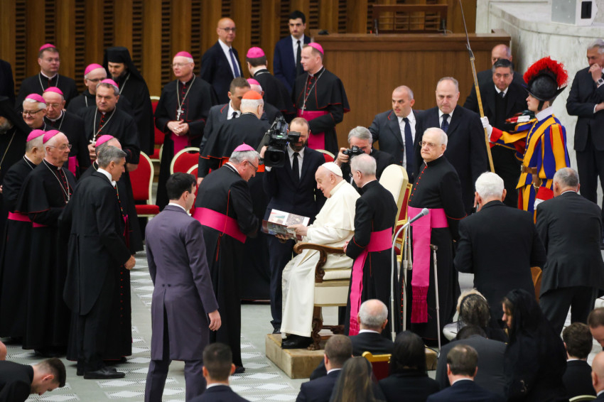 – Nagy öröm, hogy ennyien vagyunk, hiszen amikor októberben elkezdtük szervezni ezt a zarándoklatot a Szentatya engedélyével, akkor az apostoli ház felelős tisztségviselője azt kérdezte, hogy leszünk-e négyszázan. Mert ha négyszázan leszünk, akkor a Kelemen teremben elférünk, de ha annál többen leszünk, akkor a VI. Pál terembe kell menni. Akkor bátortalanul mondtam: