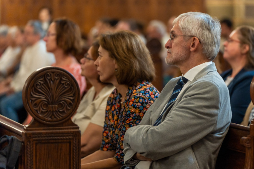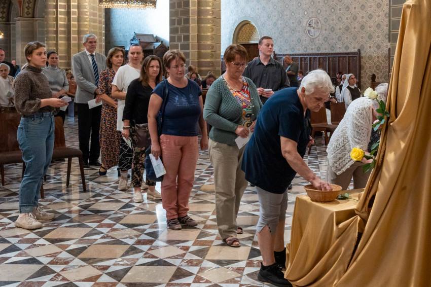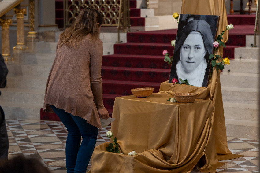 Tavalyhoz hasonlóan idén is megtöltötték a székesegyházat a Pécsről és környékéről, Kaposvárról és Homokkomáromból érkezett felnőttek, fiatalok és gyermekek, akiket a Nyolc Boldogság Közösség pécsi csoportja képviseletében Valter Margit nővér köszöntött Lisieux-i Kis Szent Teréz virágokkal díszített portréja előtt.
