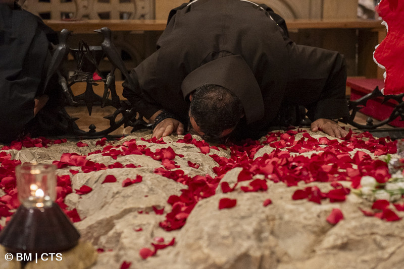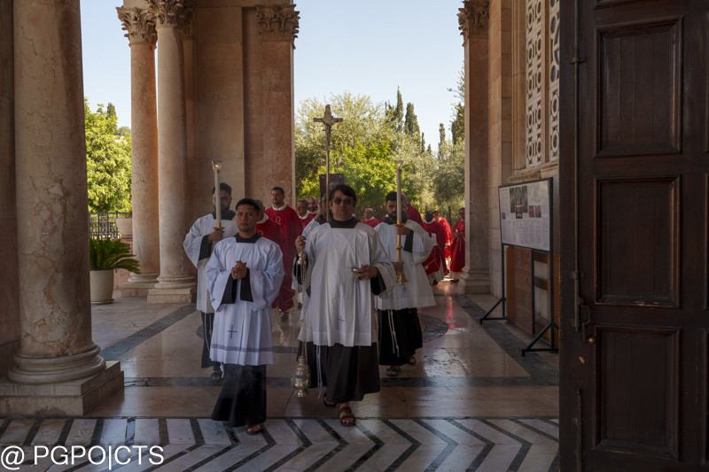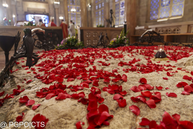 Vércseppekhez hasonlatos vörös rózsaszirmok hullottak a Getszemáni-kert sziklájára, ahol Krisztus vérrel verejtékezett (vö. Lk 22,39–44), miközben a Vexilla Regis himnuszt énekelték a Megváltó Szent Keresztjének tiszteletére. Ezzel kezdődött a szentmise és az Úr Jézus Krisztus Legszentebb Vérének ünnepe a jeruzsálemi Nemzetek templomában (Agónia-bazilika).