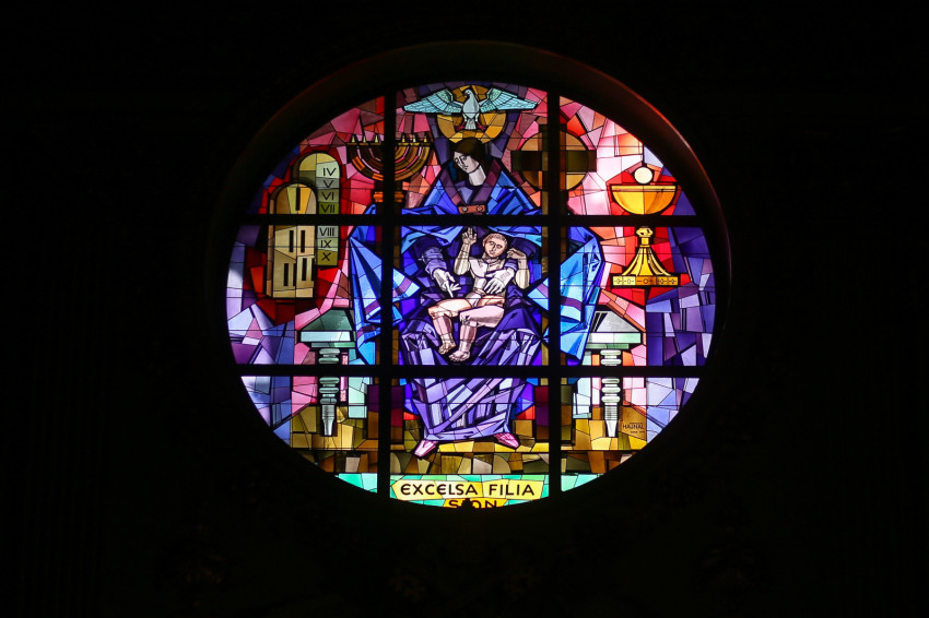 Érdekes magyar vonatkozás a főbejárat fölötti üvegablak. Ez Giovanni Hajnal, Hajnal János (1913–2010) alkotása. 1948-ban (sok más művésszel, értelmiségivel egyetemben) elhagyta hazánkat, és Rómában telepedett le. Festőként, illusztrátorként, majd pedig üvegablak- és mozaikművészként is ismertté vált. A fény, a formák és a színek dinamikus játékát létrehozó ablakai megtalálhatók a milánói dómban, a vatikáni VI. Pál kihallgatási csarnokban, megannyi templomban, kollégiumban. A Havas Boldogasszony-bazilikában Máriát mint Sion leányát jelenítette meg: az ószövetségi szimbólumokat (a tízparancsolat kőtáblái, menóra) a Szentlélek erejéből Gyermekét ölében tartó Szűzanya alakjával vezeti át az Újszövetségbe (kereszt, Eucharisztia). Így kifejezésre jut Mária szerepe a két szövetség rendjében: egyfajta kapocs ő, amely egybefogja a kettőt, s a tőle született Jézus Krisztus az, akivel elérkezett az Ószövetség beteljesülése az Újszövetségben.