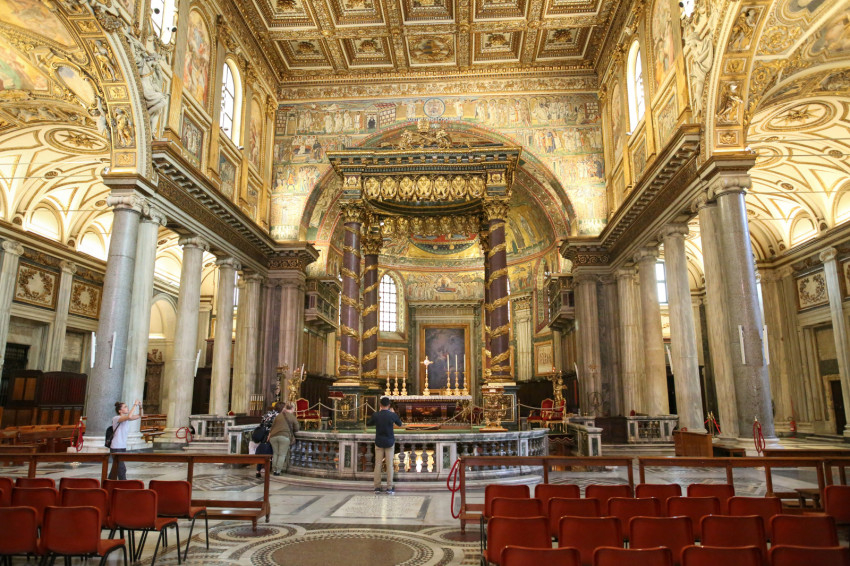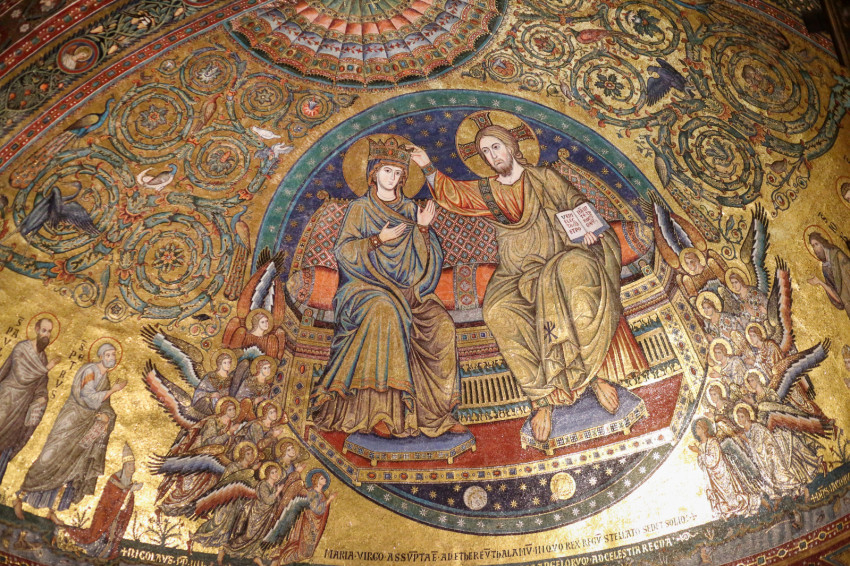 • Az apszisban Jacopo Torriti alkotását látjuk (1295). Az ablakok között Mária életének jelenetei tűnnek elénk, fölül pedig a mennyei dicsőségben látjuk Mária megkoronázását. A gondolat a jeruzsálemi hagyományt tükrözi: eszerint Mária lelkét elszenderülésekor Krisztus vitte a mennybe, majd a nyolcadik napon tizenkét angyal emelte az égbe a Szűzanya romlatlan testét. Ez magyarázza meg, hogy Jeruzsálemben őrzik Mária sírját, illetve azt, hogy augusztus 21-én, nyolc nappal Nagyboldogasszony után megüljük Mária mint égi királyné ünnepét. Torriti a császári trónon ülő Krisztust mutatja, aki maga mellé fogadja édesanyját, s kezével koronát tart a feje fölé.
