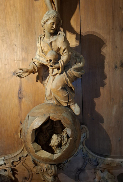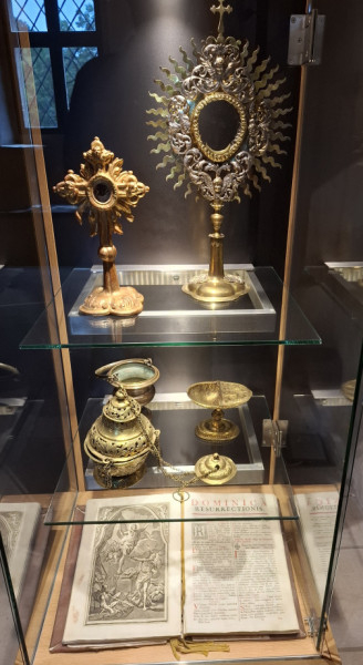 A termek sarkában a 16. és a 17. századból származó nehéz páncélok sorakoznak, üveg mögött. A teljes vértezet a lábfejtől az arcig valamennyi testrésznek védelmet nyújtott.