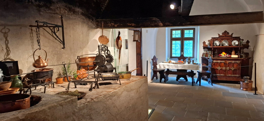 De lépjünk tovább, hiszen annyi az érdekesség a várban! Remekül berendezett konyha és ebédlő is van, ahol mindenféle edények másolatait tekinthetjük meg, sőt még egy vasból készített, forgatható nyársat is. A fogaskerékkel ellátott szerkezet lehetővé tette, hogy a hús fokozatosan és egyenletesen süljön.