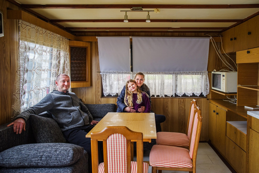 A mobilház biztonságos elhelyezéséhez a karitász munkatársai fát vágtak, terepet rendeztek, lépcsőt építettek, valamint stabilan alátámasztották az ideiglenes lakóházat. A többórás munkába a szomszédok is besegítettek, a fiatal, kétgyermekes házaspár pedig boldogan vette át a mobilház kulcsát, és foglalta el új lakhelyét.