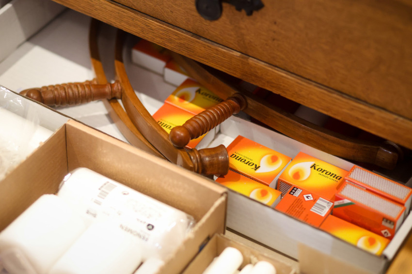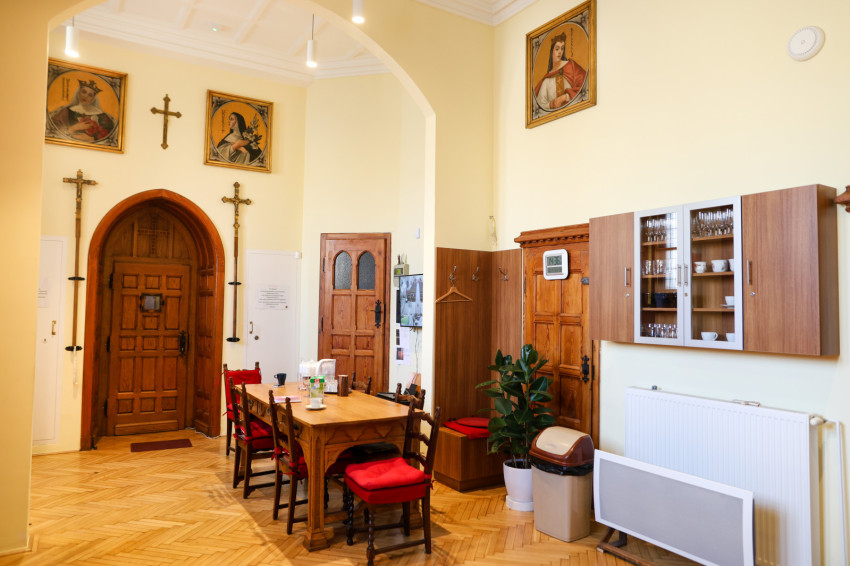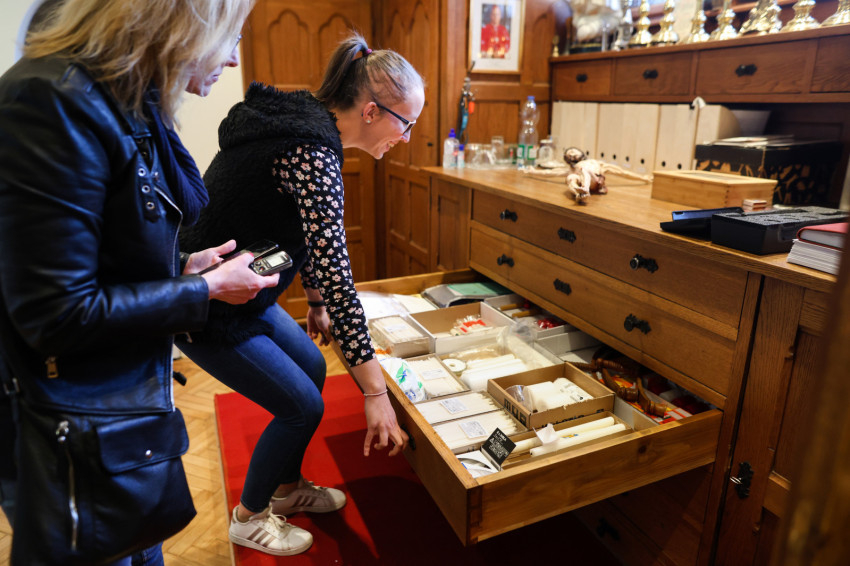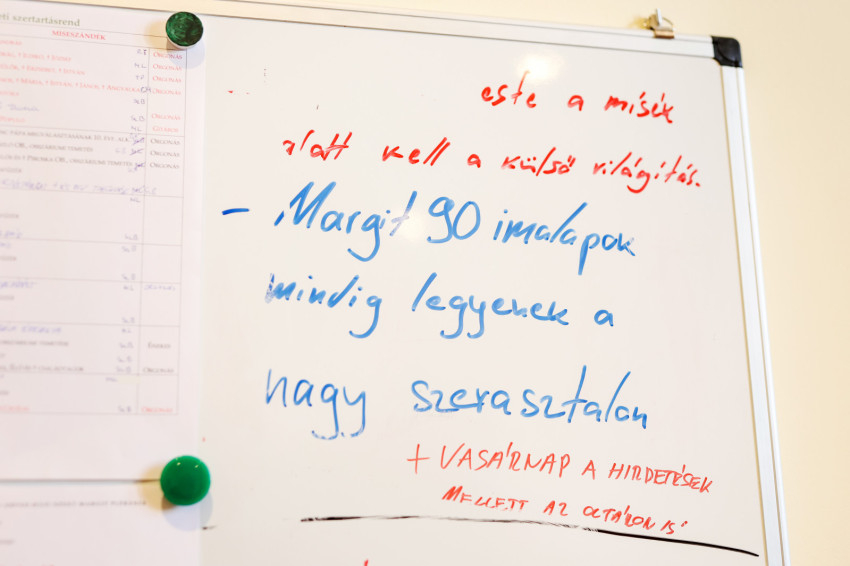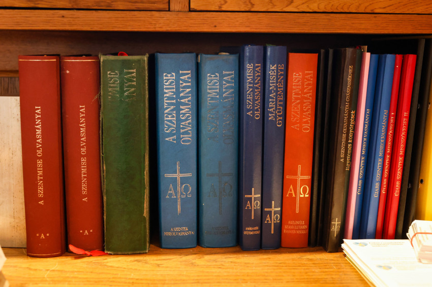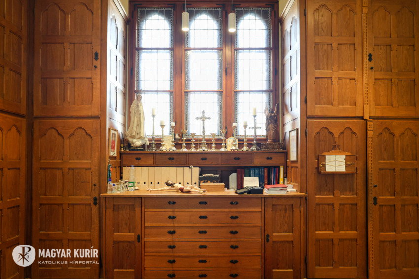 Adrienn kitárja az egyik szépen felújított szekrény ajtaját, amelyben a miseruhákat és a stólákat őrzik. „Tudjuk, melyik kazula Laci atyáé, melyik Bálint atyáé. Vannak vendég papoknak szánt ruhák is. Ezeket is mi tisztítjuk, de nem kell hazavinnünk őket, mert van itt mosógépünk és vasalónk” – magyarázza Adrienn. „Varrni a legnehezebb – teszi hozzá Zsolt, de Adrienn nevet, mert mint mondja, „Zsolti nagyon szépen tud varrni”. Kinyitják az asztal egyik fiókját: itt tartják a szépen elrendezett varrókészletet, amit még nagymamáink is megirigyelhettek volna. Mellette, a műszaki fiókban, ugyanilyen rendben sorakoznak a különböző szerszámok. Az asztal túloldalán, a talált tárgyak fiókjában még egy 1820-as kiadású latin nyelvű könyv is várja a tulajdonosát. Egy másikban pedig az előre elkészített imacédulák sorakoznak.