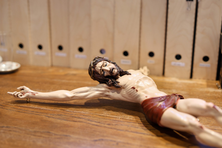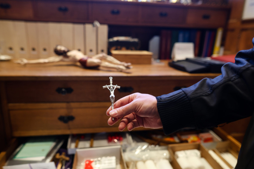 Nagypénteken a kereszthódolat áll a liturgia középpontjában. Ehhez van egy olyan feszület, amit egész évben nem látunk – egy másik szekrényben őrzik, a feltámadási kereszt mellett.
