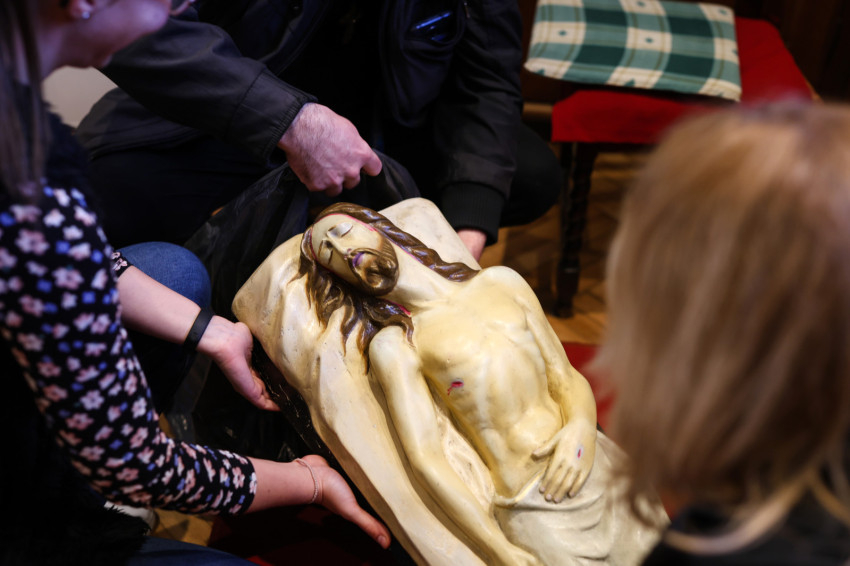 Itt van a halott Krisztus szobra, a feltámadt Krisztus szobra, egy 17. századi barokk oltárkereszt és egy díszes misekönyvtartó is, amelyet a nagyböjtben egy fából készült másik helyettesít. „A szent sírt nagycsütörtökön, zárás után készítjük elő – mondja Zsolt. – A gondnok szokott segíteni a megépítésében, mert az emberléptékű sírt nehéz mozdítani.”