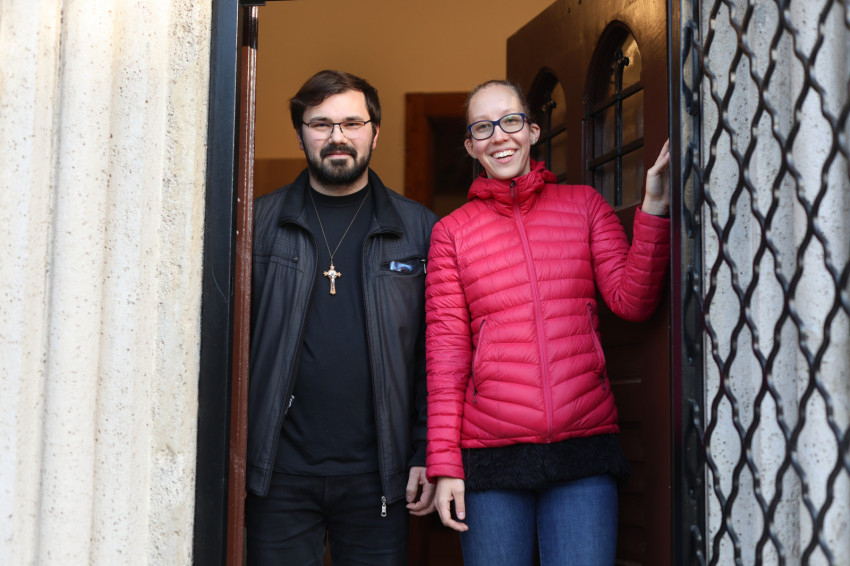 Zsolt két éve van főállásban a Budapest-Újlipótvárosi Árpád-házi Szent Margit Plébánián, Adrienn majdnem öt éve. Azelőtt óvónőként dolgozott. Itt először több mint két és fél évig sekrestyés volt, utána lett irodavezető. Vasárnap délelőttönként és a nagy ünnepeken besegít Zsoltnak, aki két évig papnak készült Esztergomban. Aztán felismerte, hogy inkább a háttérmunka való neki. Amikor Monostori László atya sekrestyést keresett, szívesen vállalta a feladatot.