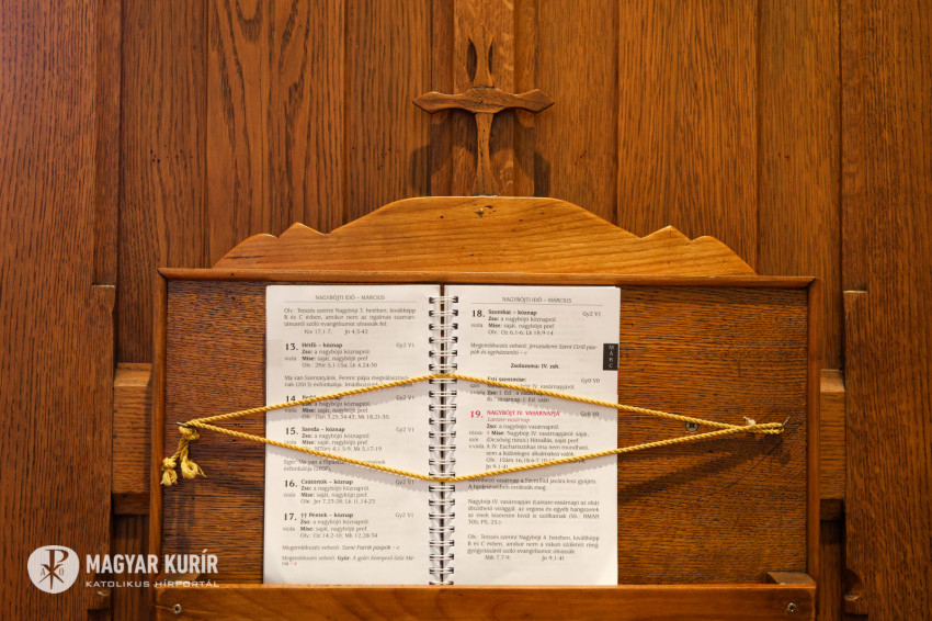 Nagycsütörtökre gondoskodni kell arról is, hogy meglegyen a tizenkét apostol „helyettese”, akiknek az atya a szertartás alatt megmossa a lábát. Az ehhez használt fémlavór a „mindent elnyelő szekrényben” várakozik, az ideiglenes tabernákulum mellett, ami a Szent Margit-fülkében, a templomhajó oldalában kap helyet a szent három napon. Erre teszik majd az örökmécsesként szolgáló, most még szintén a szekrényben nyugvó piros lámpát. De itt vannak egy dobozban a kereplők is. „Tegnap a kisbárányokkal (az elsőáldozás előtt álló kisministránsokkal) kerepeltünk – mondja Adrienn, és mutatja is helyes mozdulatot, hogyan kell ezt csinálni. – A gongot és a csengőt már megszokták, de kereplőt még nem láttak a kicsik.” „A ministránsoknak azt is meg kell tanítani, hogy lábmosásnál az egyik férfinak a bal, a másiknak a jobb lábát mossák, mert precíznek kell lenni, gyorsnak és pontosnak, hogy szépen haladjon a szertartás” – magyarázza Zsolt.