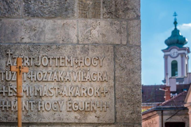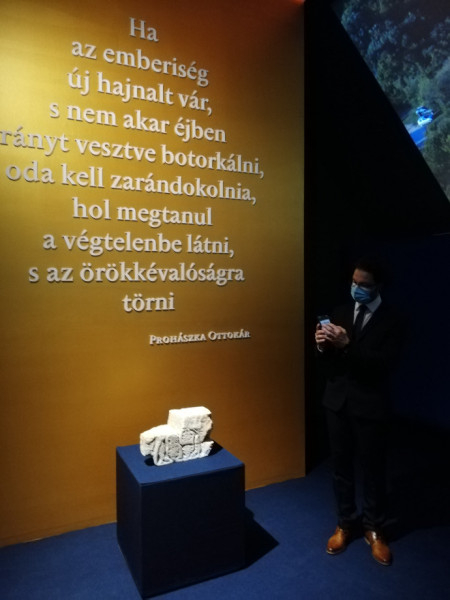 A látogatóközpont központi termében egy idézetet olvashatunk Prohászka Ottokár püspöktől, amely nagyszerűen kifejezi ennek a helynek a szellemét, üzenetét. „Ha az emberiség új hajnalt vár, s nem akar éjben irányt vesztve botorkálni, oda kell zarándokolnia, hol megtanul a végtelenbe látni, s az örökkévalóságra törni” – a falon lévő idézet alatt látható a kő.