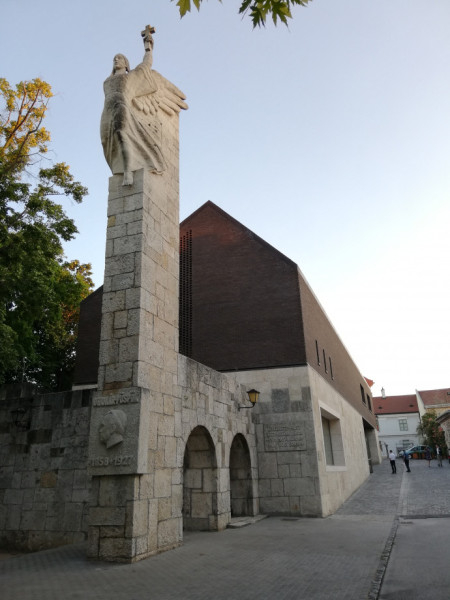 Ha a Lakatos utcában kissé távolabb megyünk, jól láthatjuk, hogy a Prohászka Ottokár püspöknek emléket állító kőszobor falát folytatva készült el az új épület homlokzata. Az a fal épült most tovább, amely a monostorbástya erőt sugárzó kváderköveinek markáns látványához illeszkedve készült el, Shvoy Lajos megyéspüspök szándéka szerint.