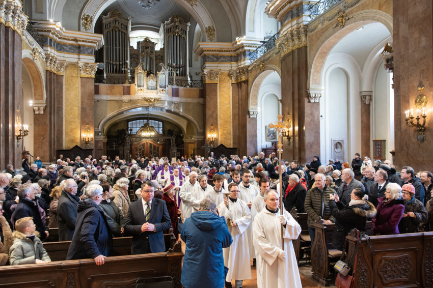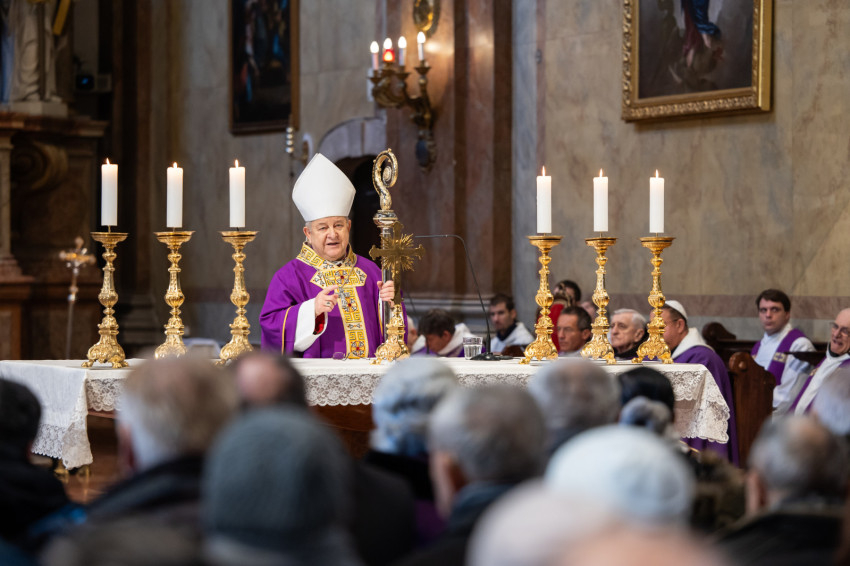 Az evangélium Szent Lukács könyvéből (6, 20–26) hangzott el. A boldogságok versszakaszhoz kapcsolódva a főpásztor prédikációjában kifejtette: amilyen kampánybeszédet az Úr Jézus mondott kétezer éve, soha, senki nem mert volna mondani. Már az is isteni voltára mutat, hogy így hívogatta követőit: „Boldogok vagytok, ha gyűlölnek benneteket az emberek, kizárnak körükből és megrágalmaznak, s neveteket, mint valami szégyenletes dolgot, elvetik az Emberfia miatt.” Így üldözték a prófétákat is, de tiétek az Isten országa! S hogy a tanítványok el ne felejtsék mindezt, az utolsó vacsorán Jézus főpapi beszédében azt mondja: ha engem üldöztek, titeket is üldözni fognak. Ezt az igazságot nagyon hamar megtapasztalták az apostolok, hiszen nem sokkal Jézus mennybemenetele után elkezdődtek az üldözések, ahogyan ezt olvashatjuk az Apostolok cselekedeteiben. A főapostolokat beparancsolták a főtanács elé, és utasították őket, hogy Krisztusról többet ne beszéljenek. Ám ők azt válaszolták: inkább kell engedelmeskedni Istennek, mint embernek. Erre megverték őket. Mégis boldogan távoztak, mert Jézusért gyalázatot szenvedhettek. Mindez túlmutat a földi kategóriákon. Később is minden úgy történt, ahogyan azt Jézus megjövendölte, kisebb-nagyobb megszakításokkal a keresztények mindig ki voltak téve az üldözéseknek, ám ez nemhogy visszaszorította volna a kereszténységet, hanem ahogyan Tertullianus ókori egyházatya mondta: