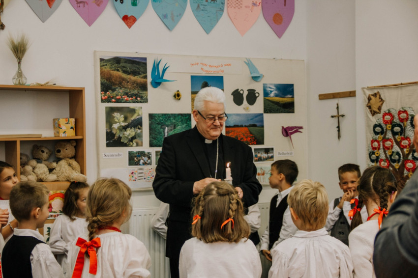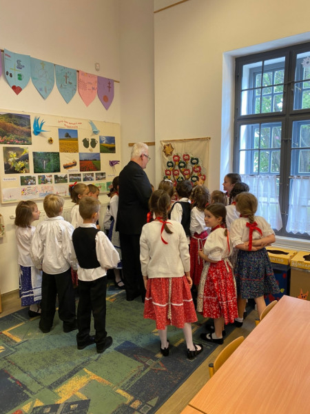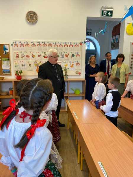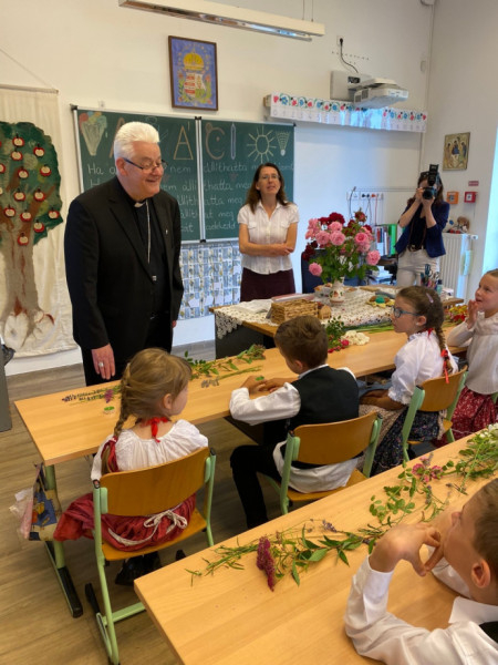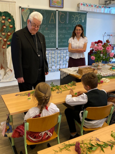 A főpásztor találkozott a pedagógusokkal, a diákokkal és a szülők képviselőivel. A ballagó diákok itt búcsúztak el iskolai közösségüktől, hálát adtak egymásért, tanáraikért, családjaikért és az elmúlt évekért. Spányi Antal püspök több osztályközösséggel is találkozott, köztük a legkisebbekkel, akik énekszóval köszöntötték névnapja alkalmából.