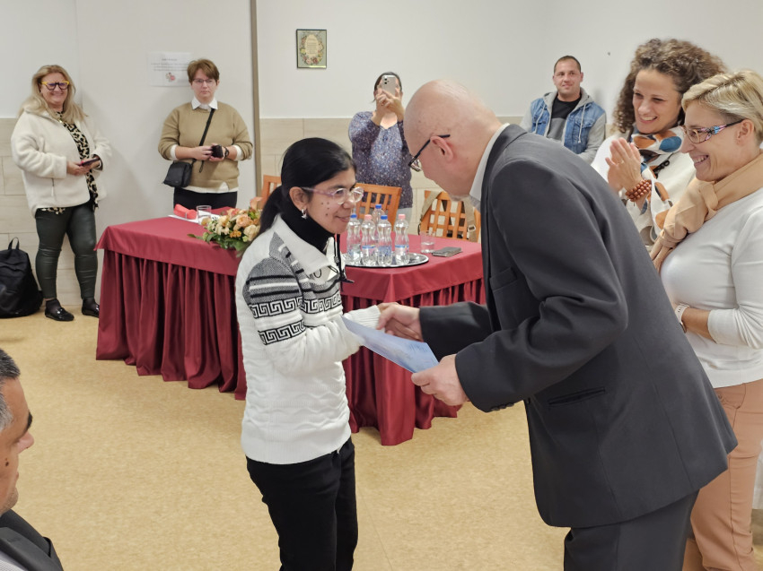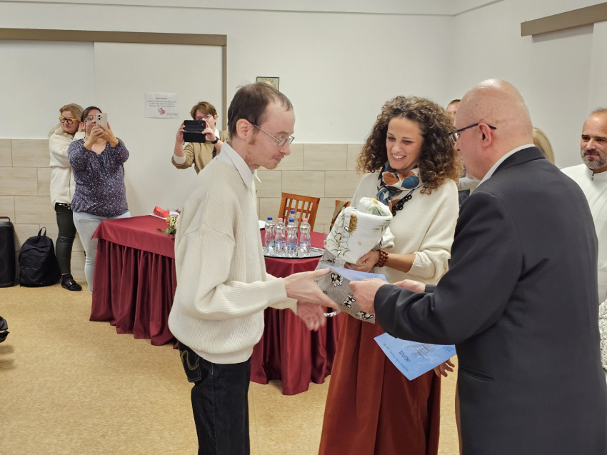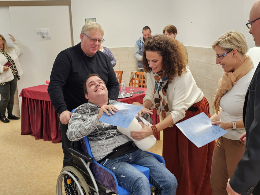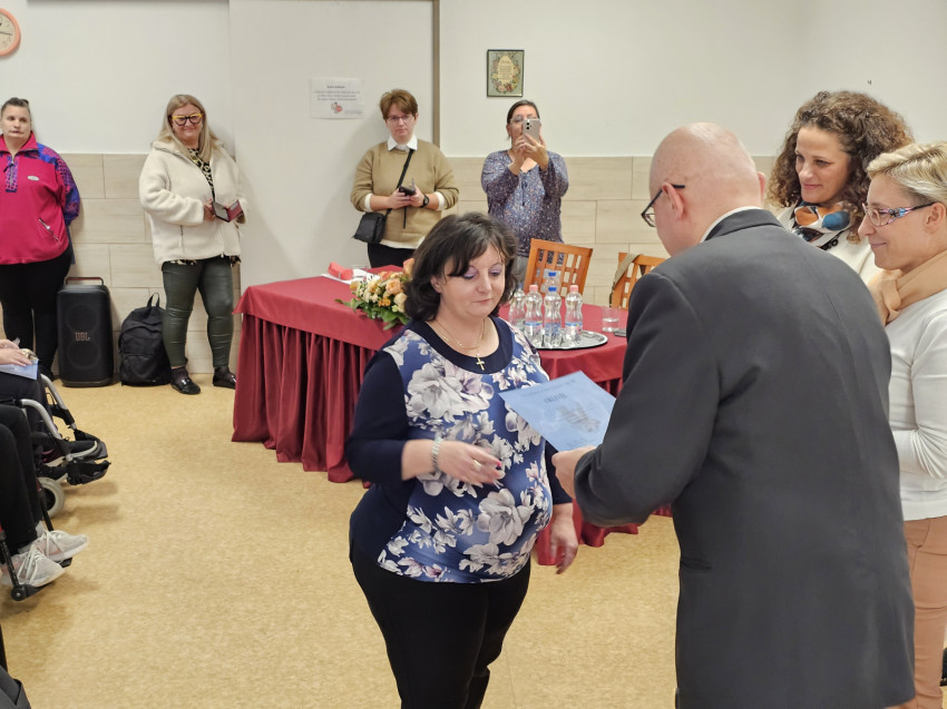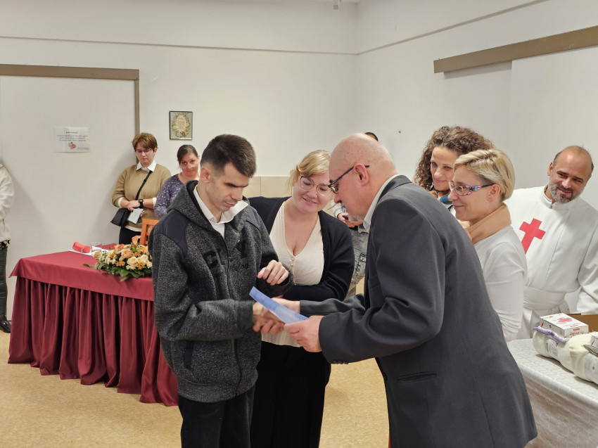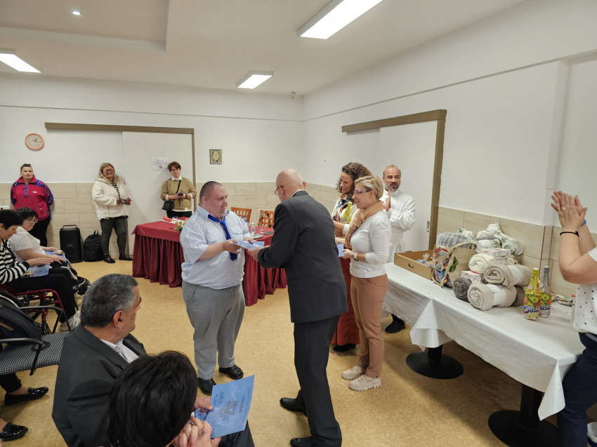 Az intézményvezető a Szent Kamill Rehabilitációs Központ fejlesztő foglalkoztatásában részt vevő gondozottak által készített termékcsomaggal, valamint borral és virággal köszönte meg a zsűri munkáját, amelyet a vendéglátó gondozottak adtak át a zsűri tagjainak.