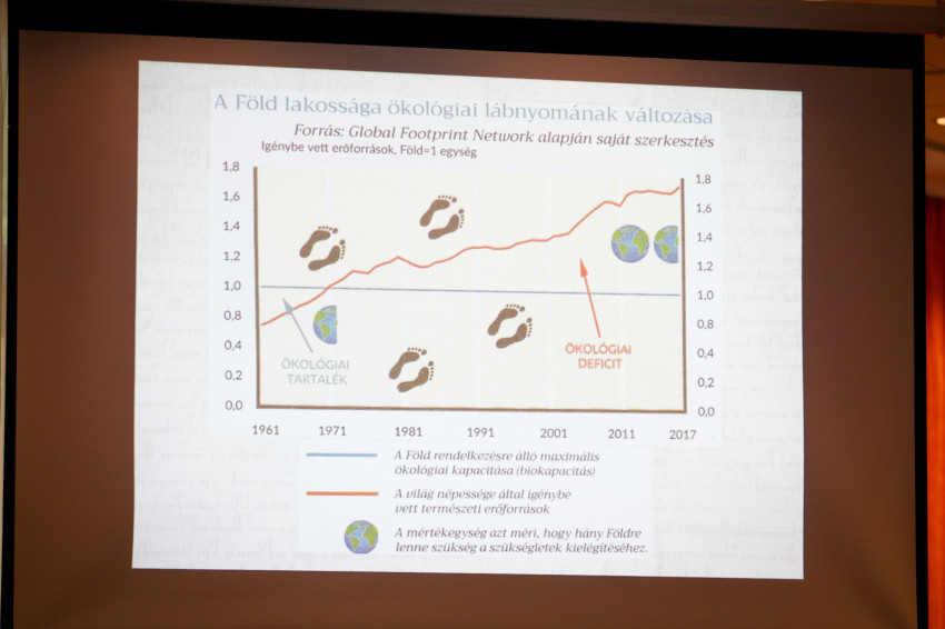 Hortobágyi Cirill megdöbbentő diagrammokat mutatott arról, mennyire megnőtt egy átlagember ökológiai lábnyoma, milyen mértékű a felmelegedés, a figyelmeztetések ellenére milyen robbanásszerű kizsákmányolása folyik a földnek.